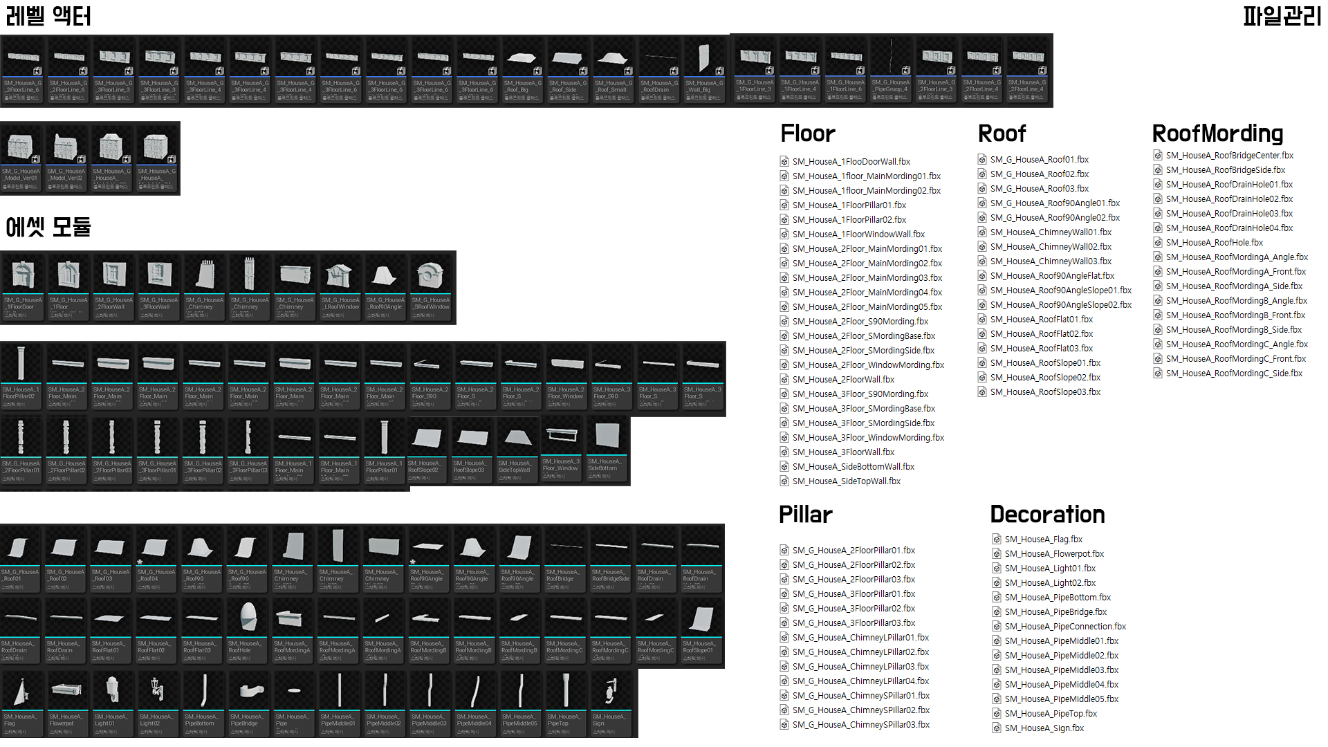 - 레벨 배치 시 편리하게 레벨 액터로 집, 층별로 정리해뒀습니다.